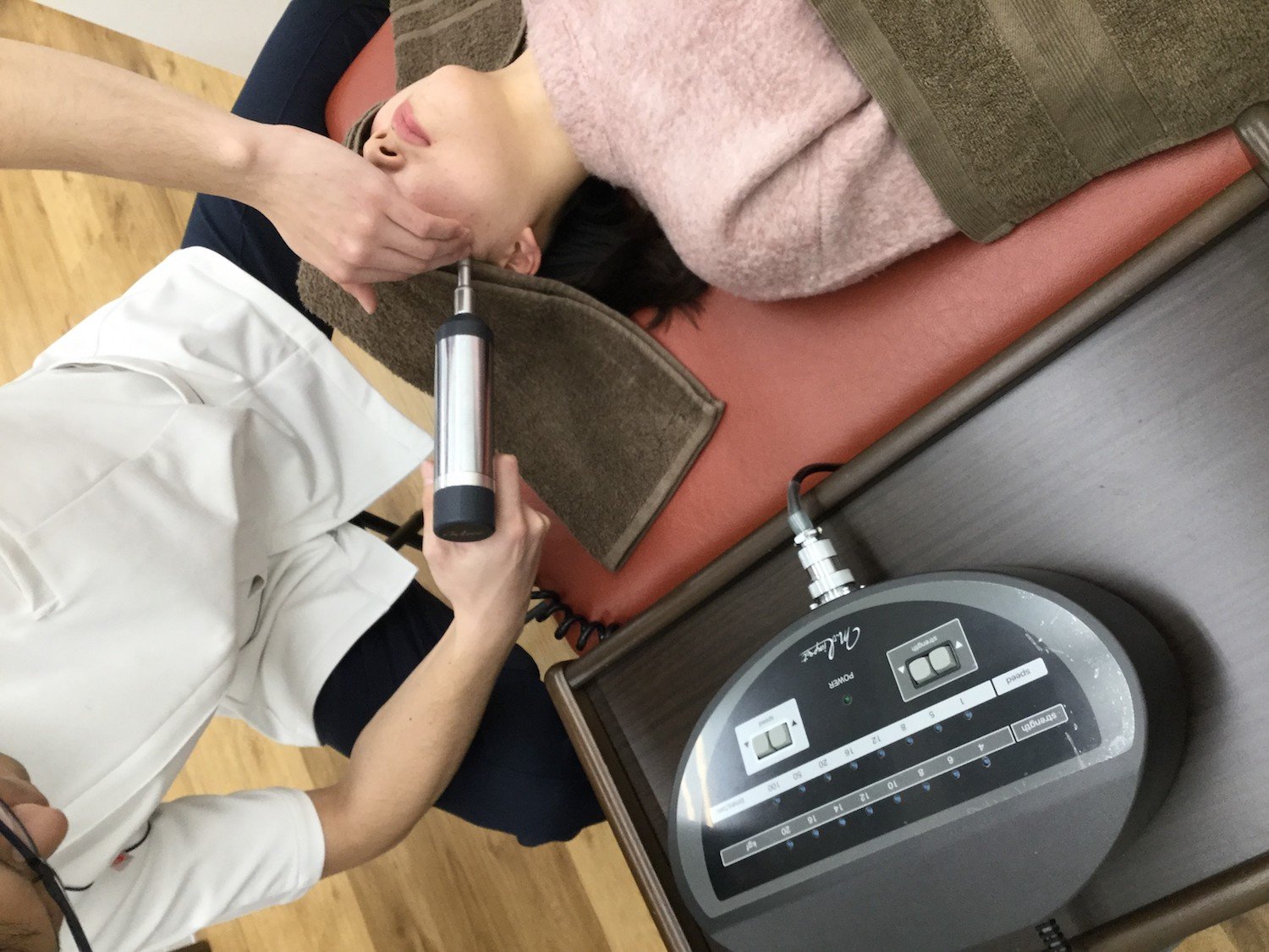 施術内容はアジャスターによる顎関節の微調節と筋肉調節を行っていきます。